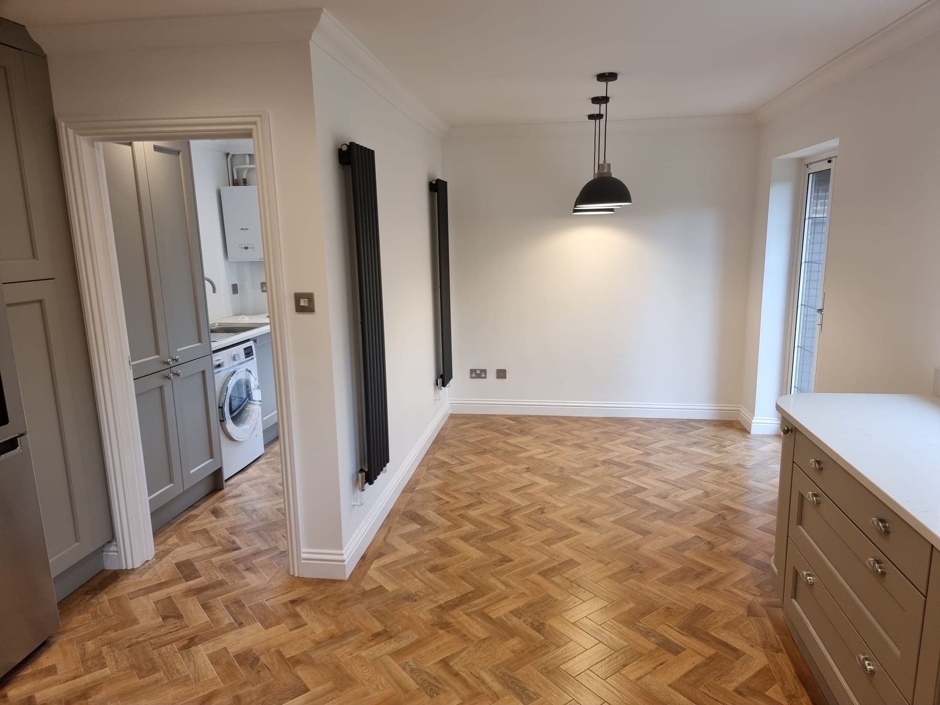 Herringbone woodflooring for this hallway, lounge & kitchen area. Strip out of all the old existing floor, self level throughout, then lay the new woodfloor